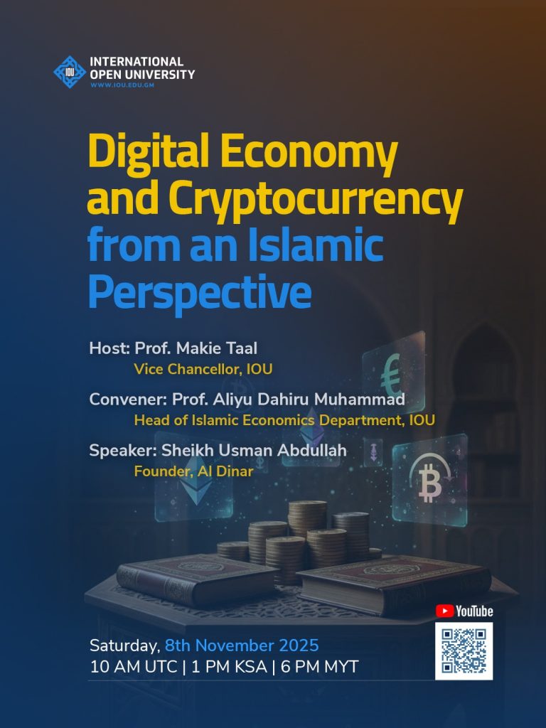 International Open University > News News & Events 5 NOV 2025 Upcoming Webinar : Digital Economy and Cryptocurrency from an Islamic perspective Youtube : https://youtube.com/... 28 OCT 2025 IOU & IIIT-WA Convene Seminar on Islamic Economics, Banking and Finance, The Gambia The International Open Univers... 26 OCT 2025 Day 2 : Program Schedule 7th ICIS 2025 Day 2: Sunday, 26th October 20... 25 OCT 2025 Highlights: IOU VC Prof Dr Makie Taal Rwanda visit Pic: IOU VC Prof. Dr. Makie Ta... 22 OCT 2025 Highlights : IOU DVC (Academics) Bangladesh visit Pic: IOU DVC (Academics) Prof ... 21 OCT 2025 IOU DVC (Academics) meets officials on Bangladesh visit Pic: IOU Deputy Vice-Chancello... 17 OCT 2025 IOU VC attends IAUP 60th Anniversary & Semi-Annual Meeting, Korea IOU Vice Chancellor, Prof Dr M... 24 SEP 2025 IOU and Al-Hikma University Vice Chancellors and officials meet Pic : IOU Vice Chancellor Prof... 24 SEP 2025 IOU Vice Chancellor and officials attend U6+ Consortium of African Universities Pic: IOU Vice Chancellor Prof ... 22 AUG 2025 IOU students invited to IHRDA training session The International Open Univers... Upcoming Webinar : Digital Economy and Cryptocurrency from an Islamic perspective 2025-11-05 03:16:39 Youtube : https://youtube.com/live/zHf72xhNKvY?feature=share