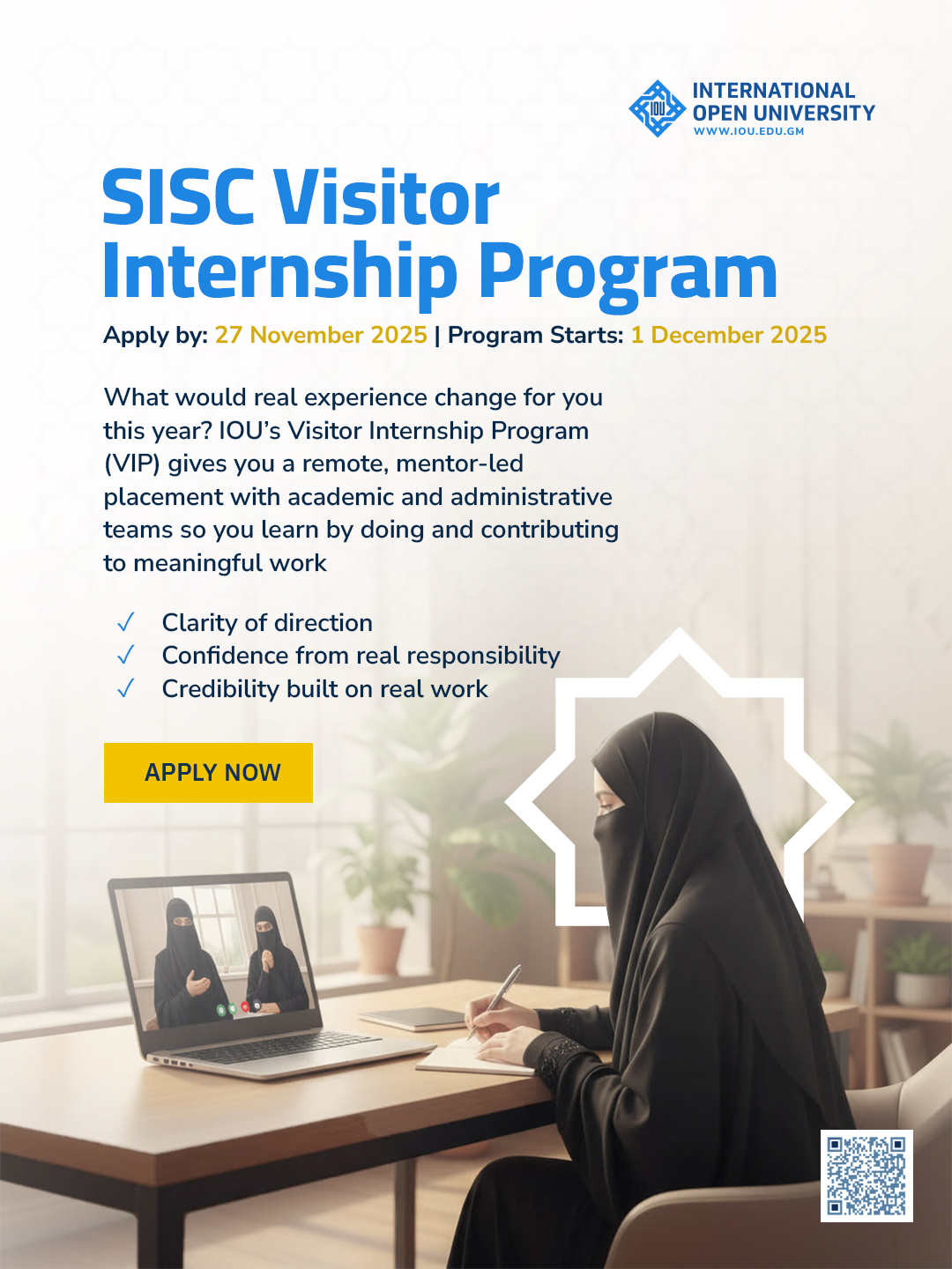 The Visitor Internship Program (VIP) offers you the opportunity to gain real professional experience while supporting the mission of the International Open University (IOU). You’ll work with IOU teams on meaningful assignments that strengthen our academic, administrative, and student support operations. Through this practical experience, you’ll build confidence, develop valuable skills, and see how faith and professionalism unite within a globally recognized Islamic institution.